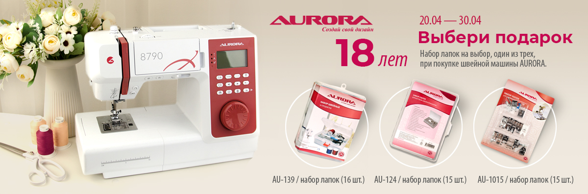 AURORA — это известный швейный бренд в России. Швейное оборудование AURORA отличается высокой надежностью, простотой эксплуатации и прекрасно подойдет начинающим мастерицам.В честь такого праздника AURORA подготовила для вас подарки и будет радовать вас до 30 апреля включительно.