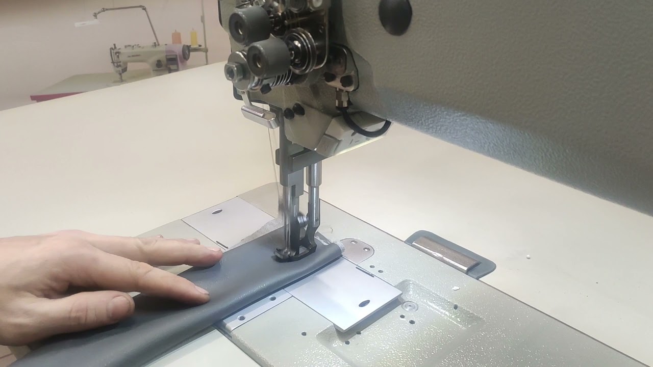 Двухигольная машина челночного стежка с тройным (унисонным) продвижением и вертикальным увеличенным челноком для тяжелых и сверхтяжелых материалов с прямым приводом.