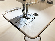 Настольная одноигольная прямострочная машина челночного стежка для шитья легких и средних материалов со встроенным в головку сервоприводом, позиционером иглы, функцией плавный старт, функцией пошагового шитья и светодиодной подсветкой области шитья.